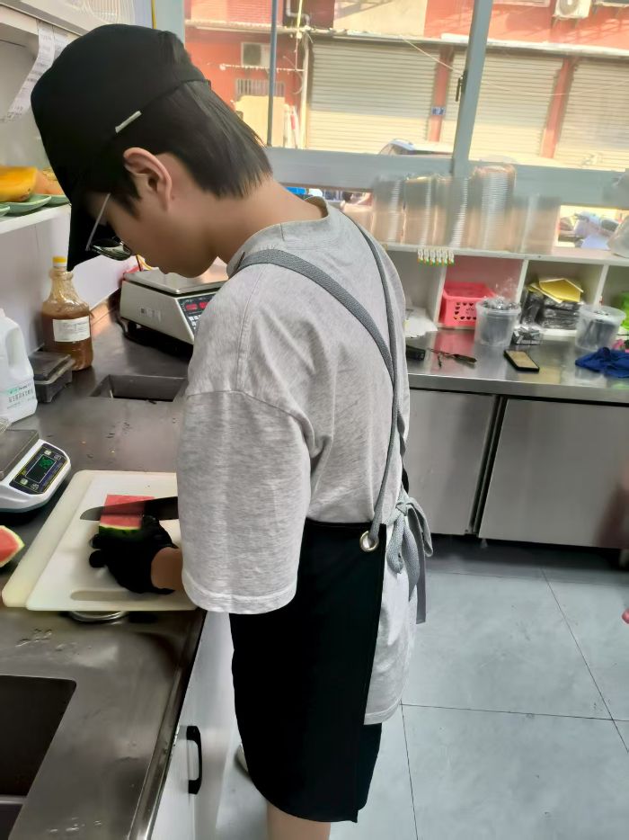 另一個時段,社區內的便民服務站點里,哈基咪的志愿者陳宇豪等,化身 “水果切配師”。他們身著圍裙、佩戴手套,為社區老年食堂、便民服務點切配新鮮水果。從挑選成熟度合適的水果,到按需求切成均勻小塊,每一步都細致入微。這些切配好的水果,會出現在老年餐桌、社區活動中心,為居民日常添一份清甜,也減輕了社區食堂的備餐壓力。
