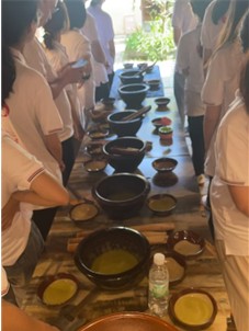 握著古樸的擂棍緩緩攪動(dòng),不同食材逐漸褪去棱角,化作細(xì)膩綿密的泥狀,擂棍象征著我們?nèi)祟愵B強(qiáng)不屈的意志,遇到任何困難要繼續(xù)堅(jiān)持和熱愛生活。沸水與茶泥的融合,恰似百川歸海,終成獨(dú)特風(fēng)味。隨后團(tuán)隊(duì)成員兩人一組在傳承人的帶領(lǐng)下親手制作擂茶并進(jìn)行品嘗。于都擂茶不僅是一種飲品,更承載著客家人熱情好客的傳統(tǒng),民間素有“家家擂茶聲,戶戶茶飄香”的歌謠。