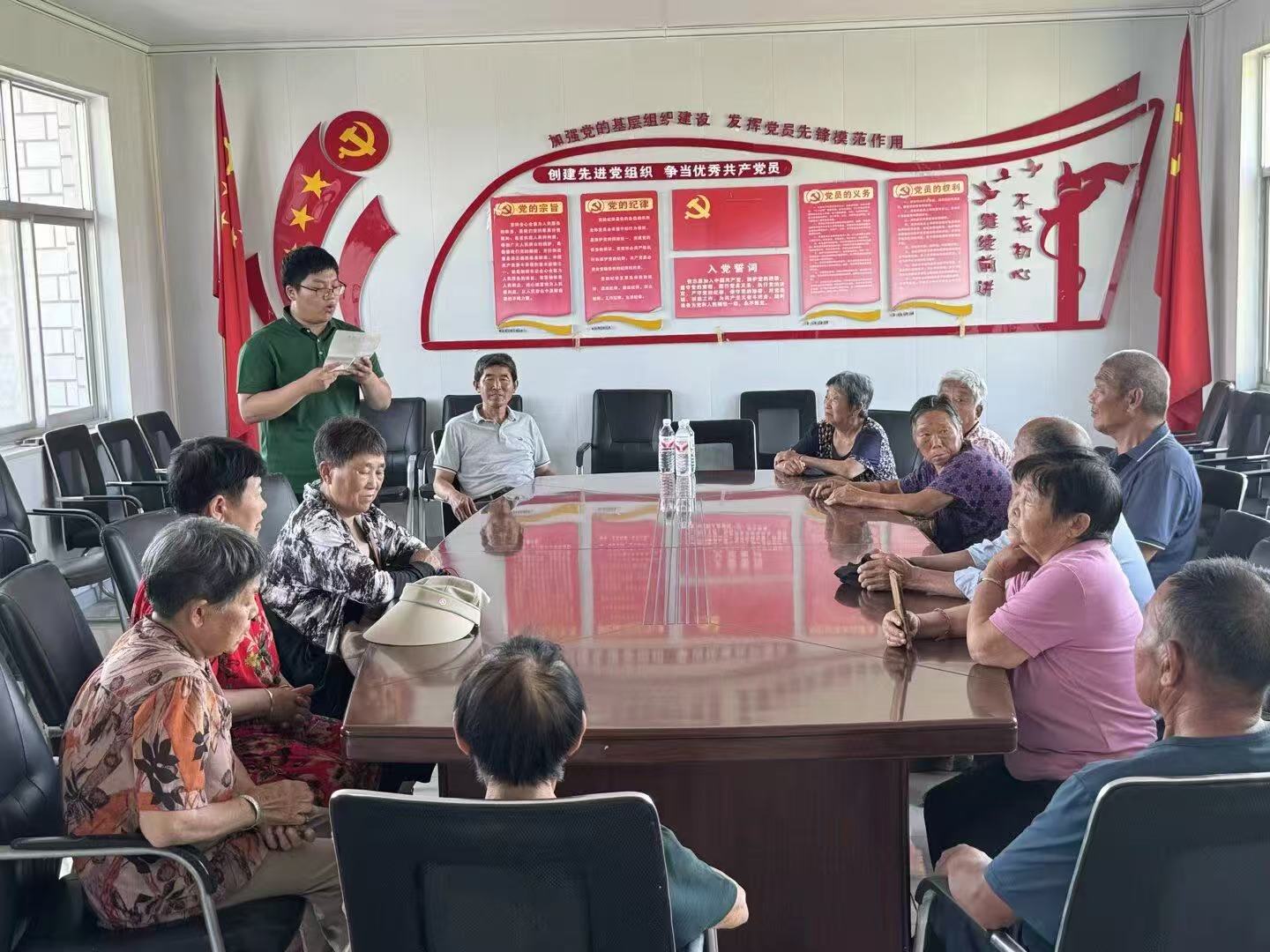 圖為團隊成員與村委會對接活動。團隊 供圖 傍晚時分,首日的行程在忙碌而充實的對接與規劃中落下帷幕。這堅實的第一步,映照著青年學子們眼中服務鄉村的堅定光芒。他們深知,與村支書的每一次坦誠交流,老師指導下的每一次思維碰撞,小組會議中敲定的每一個細節,都是為后續深入田間地頭、走進村民心坎所做的堅實鋪墊。旗幟已揚帆,藍圖已繪就,這支青春的隊伍,正以飽滿的熱情和精心的準備,準備用腳步丈量土地,用知識服務鄉梓,在鄉村振興的廣闊天地里書寫屬于他們的青春篇章。隨后的日子里,他們將把精心準備的政策宣講、環保科普帶到鄉親們身邊,讓青春熱力在鄉野沃土上盡情綻放。 三下鄉實踐活動的第二天,在下毛儀澗村村委會辦公室里,數十位村民與一群年輕身影在陽光中圍坐。青年學子們以精心策劃的宣講活動,為寧靜的村落注入了別樣的活力。“當年開山引水,手上磨出的血泡結成了厚繭……”講述者聲音懇切,昔日艱難創業的歷程通過青年們樸素的講述重煥生機。村民張大爺聽著,眼眶漸漸濕潤:“這些娃子們講的,都是我們經歷過的真事啊,那些苦日子,忘不了!”一段段村莊舊貌換新顏的故事,讓許多像張大爺一樣親歷變遷的村民頻頻點頭。青年們以鄰家孩子般的親切口吻,將宏大“振興”主題化入村莊肌理,在聽眾心中喚起深沉共鳴與強烈歸屬感。