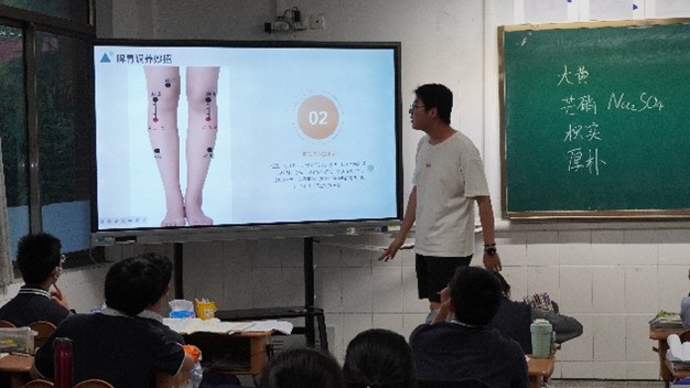 活動的高潮當屬中醫推拿展示環節。隊員們邀請幾位同學上臺,現場演示了常見的推拿手法。從輕柔的揉法,到滲透力十足的按法,再到靈活的滾法,每一個動作都細致講解。演示員袁舒暢一邊操作,一邊向同學們解釋推拿對緩解頸部、肩部疲勞的作用原理,如通過刺激穴位,促進血液循環,從而減輕肌肉酸痛。同學們躍躍欲試,在隊員的指導下,紛紛動手嘗試,現場氣氛熱烈。
