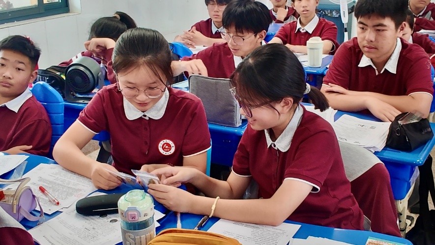 1.“識百草,嗅藥香”:山陽醫光隊為浦開學子分發中藥標本,打造課堂“中藥園”。隊員們組織學生組合《溫病條辨》經典方劑(如桑菊飲、銀翹散)藥材,認識藥物配伍。同學們通過辨識藥材形態、品鑒藥味,并在小組討論中提問,直觀感受中藥魅力,逐漸拉近與傳統醫藥文化的距離。