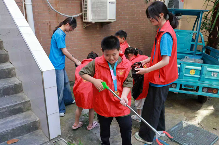 圖為實踐隊員與小朋友們在社區撿拾垃圾。施星宇、何雨凱供圖