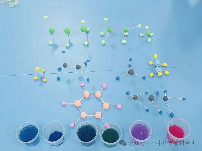 在手工環節,志愿者們帶領孩子們開展了甲乙丙烷橡皮泥模型制作活動。志愿者們先以生動比喻講解三種烷烴的分子構成,隨后,孩子們領取不同顏色的橡皮泥——黑色代表碳原子,白色代表氫原子,用牙簽作為化學鍵,小心翼翼地搭建模型。孩子們專注地將“碳原子”與“氫原子”精準連接,原本抽象的分子結構在指尖逐漸變得立體可觸。當一個個形態各異的分子模型完成時,孩子們舉著自己的作品互相展示,在動手實踐中直觀理解了甲乙丙烷的結構差異,也切身感受到微觀世界的奇妙秩序,讓化學分子不再是課本上的符號,而成為可以觸摸可以創造的“小宇宙”。