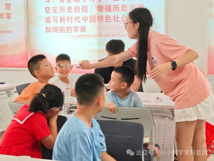 為了讓孩子們從生活現象中發現科學原理,激發對化學的興趣,“小小科學家”科普社會實踐團帶領當地小朋友們探索纖維的奧秘,通過互動游戲、實驗演示和動手實踐等豐富形式進行一場主題為“纖維的奇妙變身”的科普課。