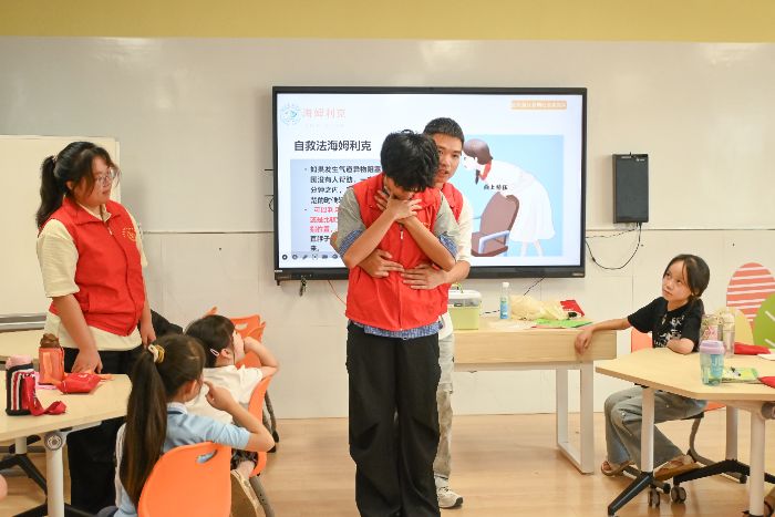 圖為孩子們學習CPR 通訊員楊貝熙攝 本次支教活動緊密圍繞“健康守護”與“快樂成長”兩大核心,精心設計了多元化課程體系。急救知識入童心,守護生命“黃金四分鐘”成為活動亮點。針對鄉村兒童可能面臨的突發狀況,志愿者們利用兒童專用模擬教具,以通俗易懂的語言和生動的情景模擬,傳授了氣道異物梗阻處理(海姆立克急救法)、外傷簡易包扎止血、燒燙傷緊急處理等基礎急救技能。孩子們在“手把手”指導下認真練習,將“救人自救”的種子悄然埋入心田。