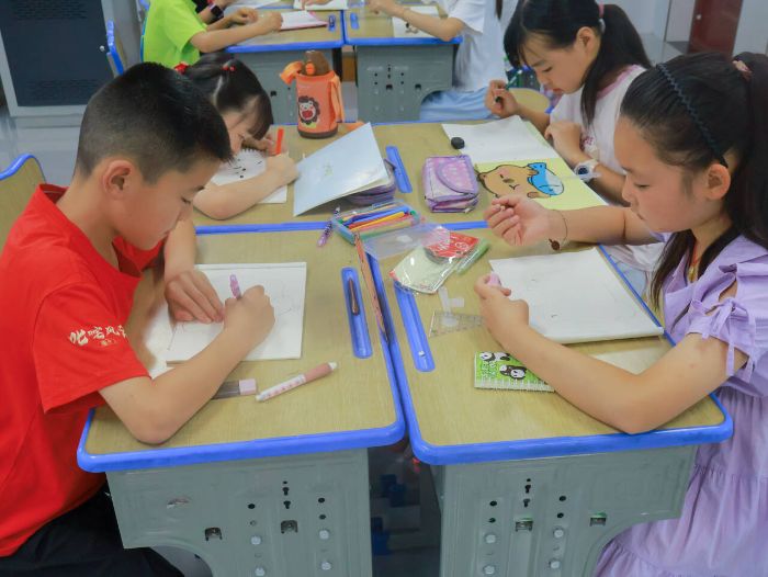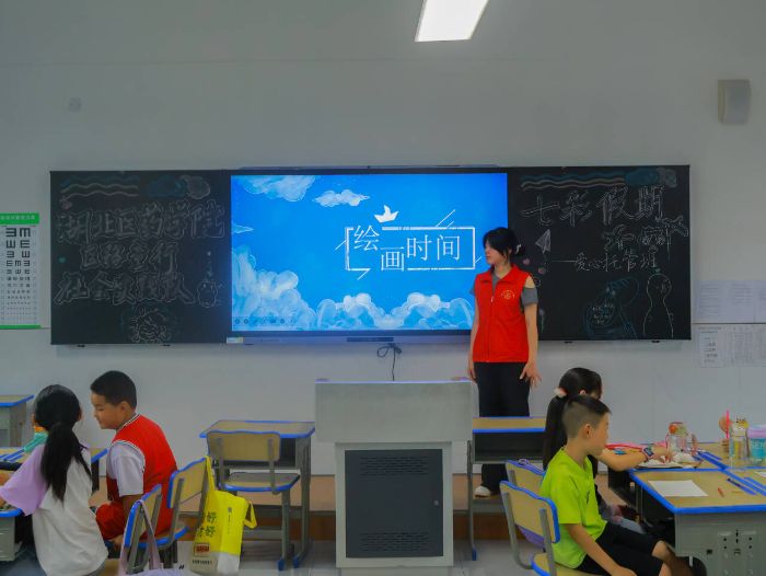 而繪畫課堂則是創(chuàng)意與想象的天地。實(shí)踐隊(duì)隊(duì)員站在講臺(tái)上,通過大屏幕展示繪畫的奇妙世界,引導(dǎo)孩子們拿起畫筆,描繪心中的美好圖景。孩子們專注地用手中的彩筆,勾勒線條、涂抹色彩,將對(duì)生活的熱愛、對(duì)未來的憧憬呈現(xiàn)在畫紙上。從多彩的校園風(fēng)景到夢(mèng)幻的童話世界,每一幅畫作都飽含著童真與幻想。