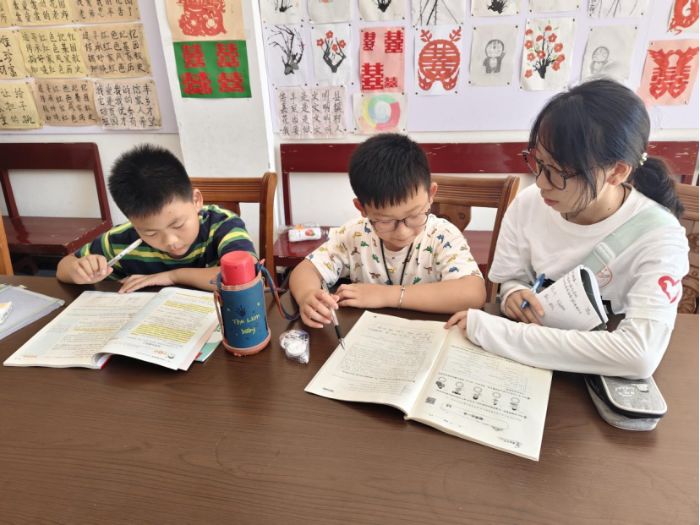 "老師,這道幾何題我還是不懂"在花園村農家書屋,志愿者們迅速化身為“小老師”,以飽滿的熱情和耐心,全身心投入到為孩子們的暑期作業輔導中。