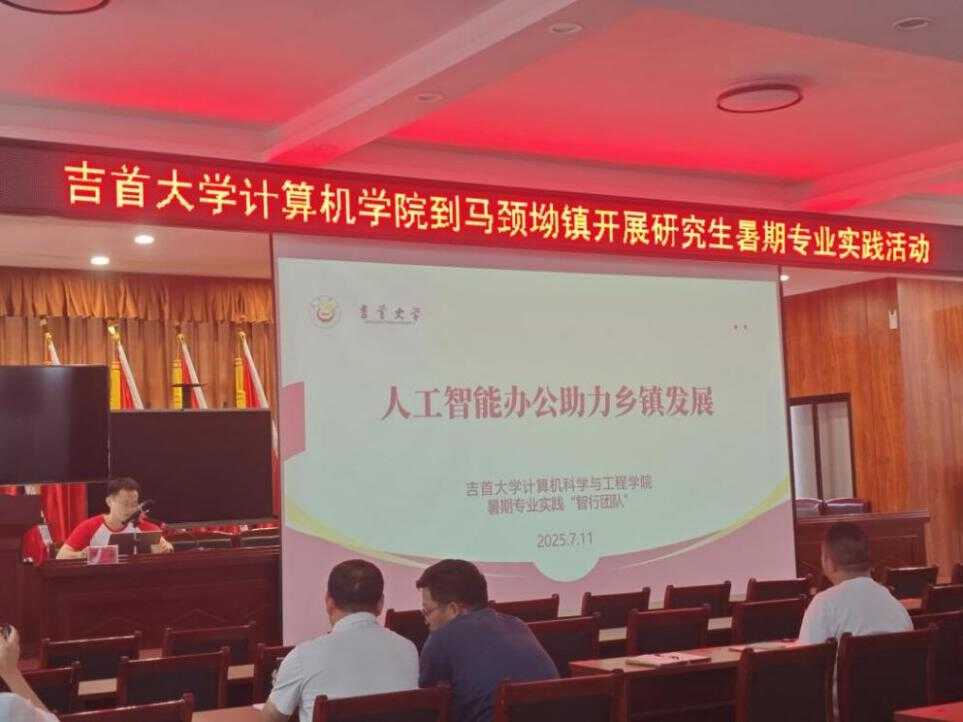 為響應國家人工智能發展戰略,推動智能技術與基層政務辦公深度融合,吉首大學計算機科學與工程學院暑期專業實踐“智行團隊”在暑假期間走進馬頸坳鎮政府,開展“人工智能辦公助力鄉鎮發展”專題講座。此次活動由吉首大學計算機科學與工程學院張院長、向老師帶隊,聚焦基層工作人員在公文處理、數據統計等場景中的實際需求,由團隊成員周鑫同學系統講解人工智能技術如何成為提升辦公效率的“利器”,團隊還同步開展了人工智能辦公問卷調查,旨在更精準地了解鄉鎮干部對智能辦公的需求與現狀。馬頸坳鎮政府各部門工作人員積極參與,共同探索人工智能在辦公領域的應用與發展。