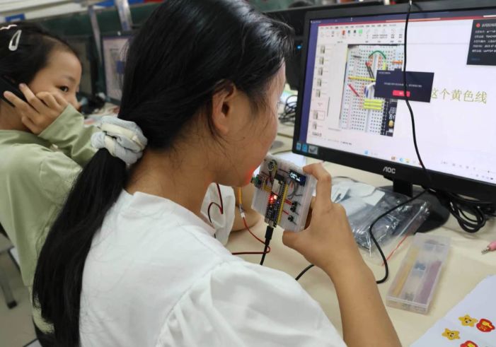 “我的AI伙伴:誕生!”實(shí)踐課無(wú)疑是整個(gè)支教的高光時(shí)刻。孩子們化身“小小工程師”,遵循著指導(dǎo),一步步組裝零件、連接線路。當(dāng)親手創(chuàng)造的AI玩具第一次“活”過(guò)來(lái)時(shí),他們臉上綻放出的驚喜與自豪,勝過(guò)千言萬(wàn)語(yǔ)。這不僅是一次技術(shù)的實(shí)踐,更是在他們心中埋下了一顆“我能創(chuàng)造”的自信種子。而最動(dòng)人的風(fēng)景,出現(xiàn)在課堂的角落:兩個(gè)內(nèi)向的小女孩正與她們親手創(chuàng)造的AI伙伴輕聲說(shuō)著“悄悄話”。那一刻,科技真正成為了有溫度的陪伴。