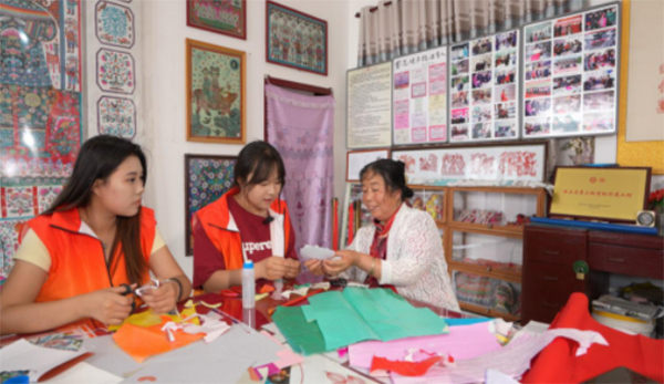 圖為孫會(huì)娥老師與團(tuán)隊(duì)成員共同剪紙