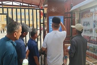 圖木舒克市44團2連、3連居民觀看防詐騙海報。柴美景 供圖