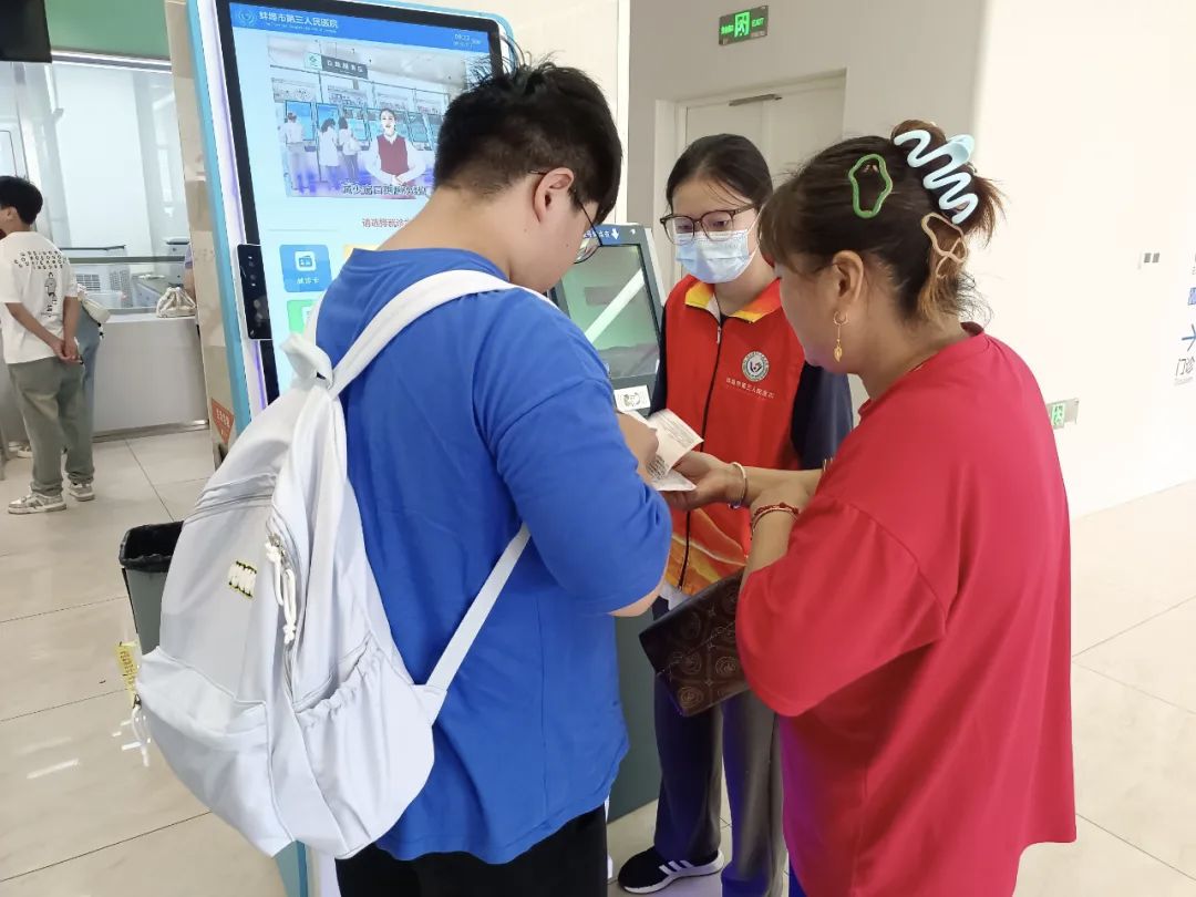 “阿姨,您把門診卡插到這里,我幫您掛號。”“爺爺,醫學影像科在3樓,我帶您過去!”……志愿者們耐心地為老年患者講解自助掛號機的使用方法,協助他們完成掛號、繳費、打印報告等操作;對于行動不便或方向感欠佳的患者,志愿者們主動上前攙扶、引導,確保他們順利抵達診室。此外,志愿者們還協助醫護人員維持候診秩序,緩解了就診高峰期的壓力。