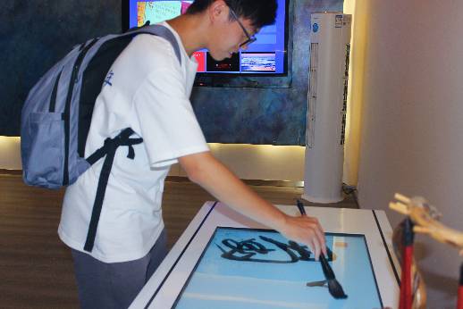 圖為團隊成員在劍閣縣文化館美術館“數字體驗區”體驗書法藝術。