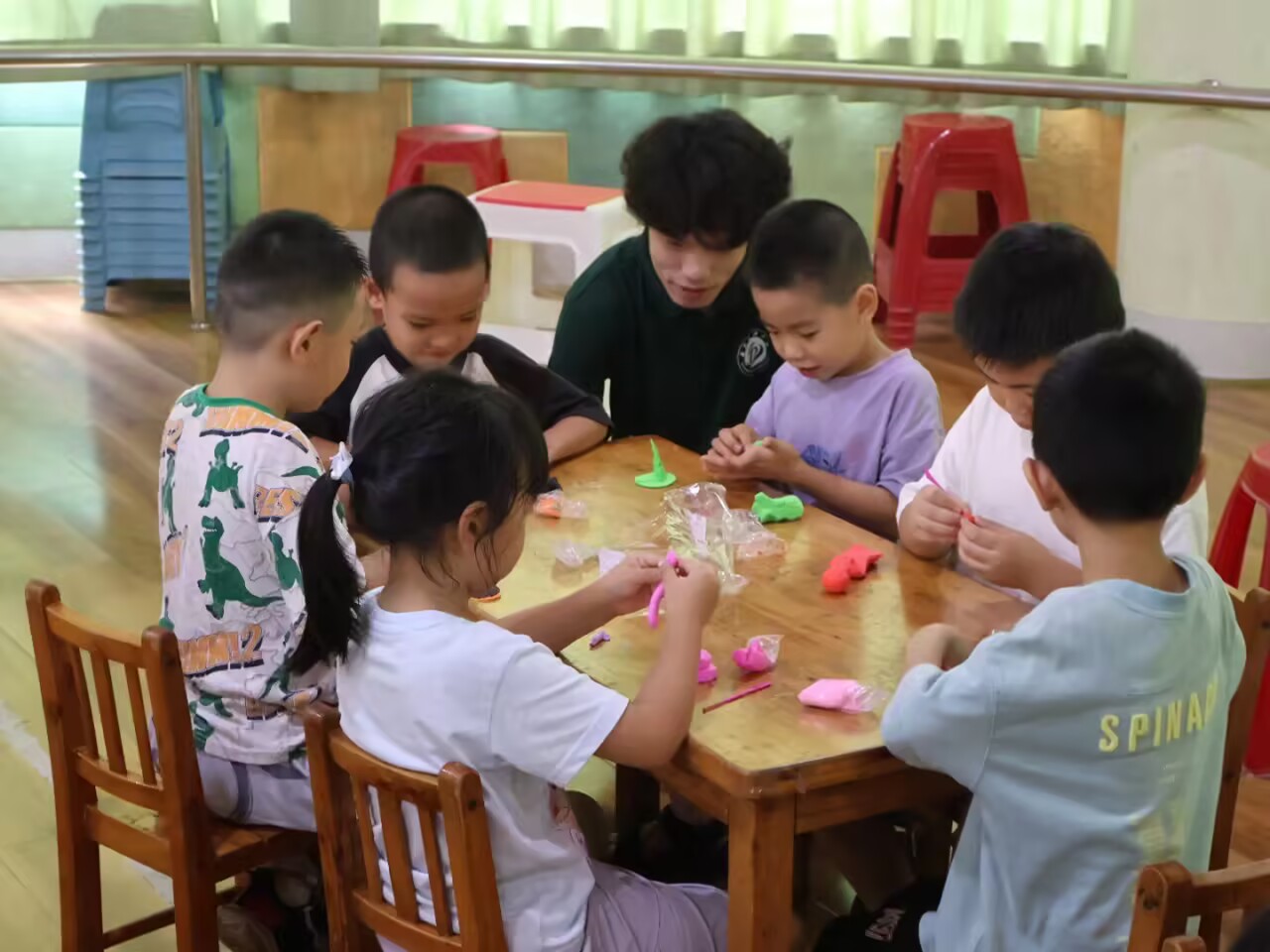 活動中,孩子們圍繞“我心中的家鄉”主題,用五顏六色的粘土盡情創作。有的捏出家鄉標志性的建筑,有的塑造出家鄉的特色美食,還有的還原了家鄉的美麗山水。實踐隊志愿者們分組進行指導,耐心教授孩子們揉、搓、捏、粘等基本造型技巧,幫助他們將腦海中的家鄉模樣轉化為生動的粘土作品。在創作過程中,孩子們相互交流想法,分享創作靈感,遇到難題時齊心協力解決,展現出的團隊合作精神十分動人。一件件充滿童真與想象力的粘土作品相繼誕生,每一件都凝聚著孩子們對家鄉的真摯情感與獨特理解。
