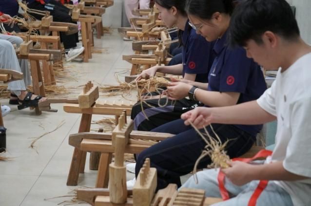綜合樓201教室,學編紅軍草鞋的課程熱鬧又莊重。劉文強老師耐心講解技法,大學生們從穿草鞋的體驗,過渡到親手編織。穿針引線間,手掌的酸痛,讓他們更深刻體會革命先輩長途跋涉的艱辛。從“了解草鞋”到“制作草鞋”,大學生們觸摸的不僅是物件,更是“自力更生、艱苦奮斗”的精神內核。