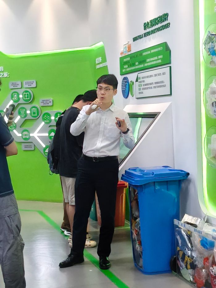 在分揀中心現(xiàn)場,2016級校友金鵬率先向同學(xué)們講解了固體廢物資源化處理的整體行業(yè)背景與具體操作流程。通過其詳細(xì)闡述,同學(xué)們深入理解了外賣餐盒、奶茶杯、泡沫塑料、利樂包裝、購物袋等典型低值可回收物的定義范疇與物質(zhì)特性,同時也認(rèn)識到這類廢棄物在資源化利用過程中面臨的經(jīng)濟性瓶頸——因分選難度較高、市場價值偏低,傳統(tǒng)人工分揀模式難以實現(xiàn)規(guī)模化高效回收,部分物料常被歸入焚燒處理環(huán)節(jié),既造成資源浪費又加劇碳排放壓力。