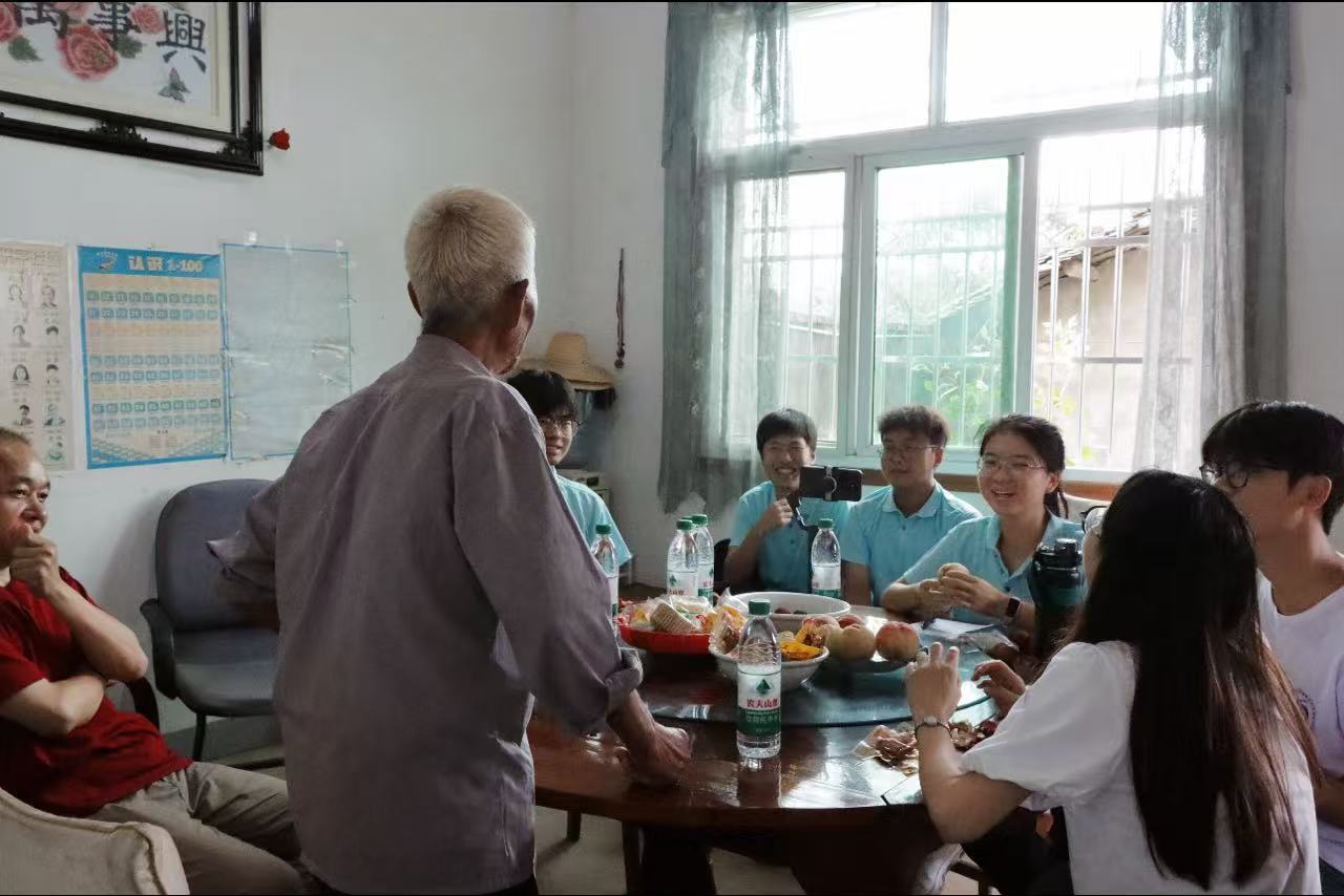 第一站實踐隊踏入栗坂村。在農家質樸的堂屋里,白發蒼蒼的老黨員站在席間,用帶著歲月滄桑的聲音,緩緩講述自己的人生故事。隊員們圍坐一旁,或專注傾聽,或輕聲交流,桌上水果、礦泉水相伴,在這其樂融融的氛圍里,青春與白發對話,往昔奮斗與當下實踐交融,讓紅色傳承在親切嘮家常中,悄然沁入每個人心底。