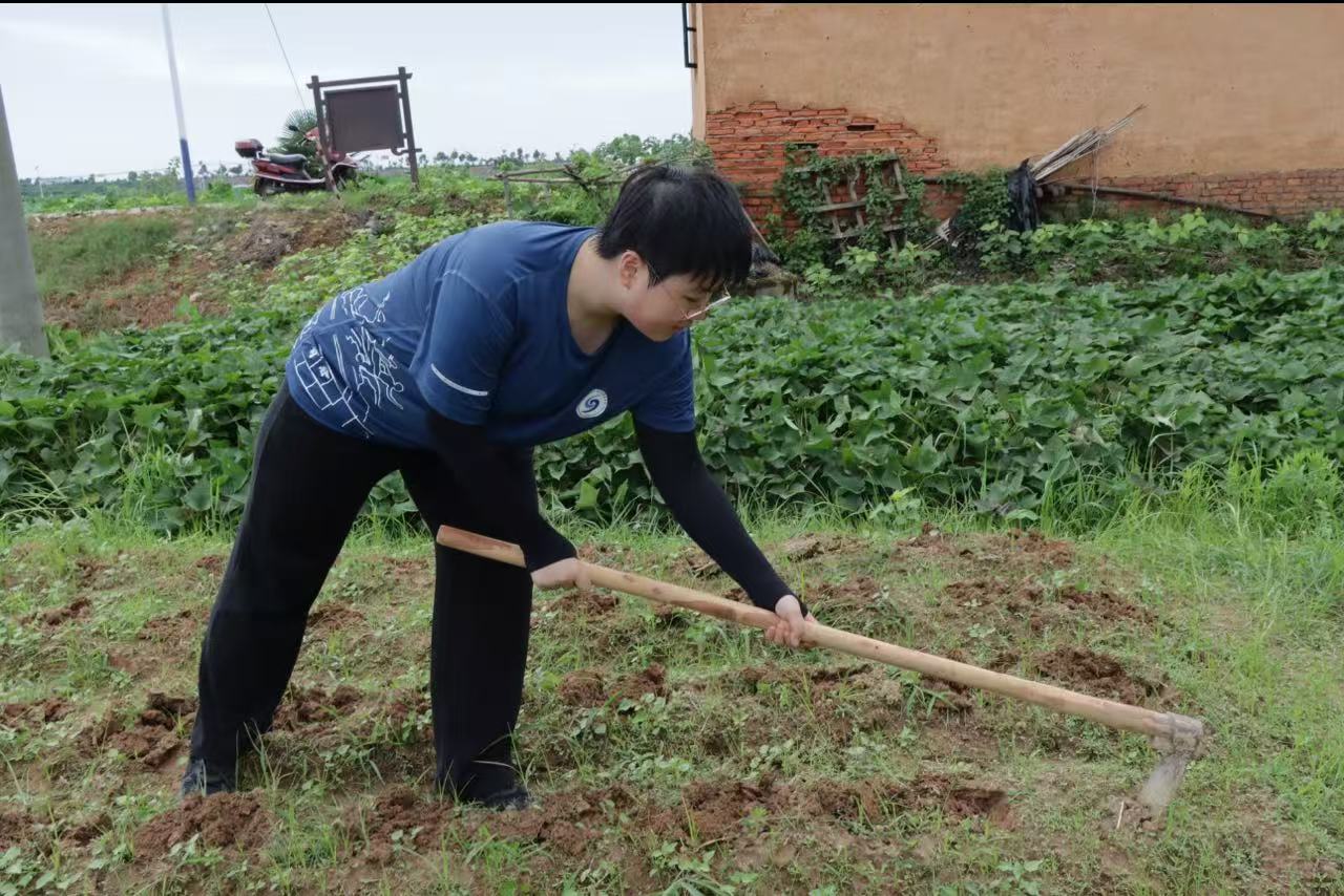 “薯藤得斜著栽,根部埋深些,葉子要透氣。”墾荒園的叔叔教我們的。第一次踩上松軟的土地,新翻的泥土裹住腳踝,潮濕的土腥味混著草木香撲面而來。有人握鋤時總刨得深淺不一,有人捏著薯藤無從下手,手掌很快被粗糙的莖稈磨得發(fā)紅。叔叔蹲下身,用沾滿泥土的手指劃出標準的栽種間距:“記住,薯苗要像排隊的士兵,根扎得正,才能長得壯。”