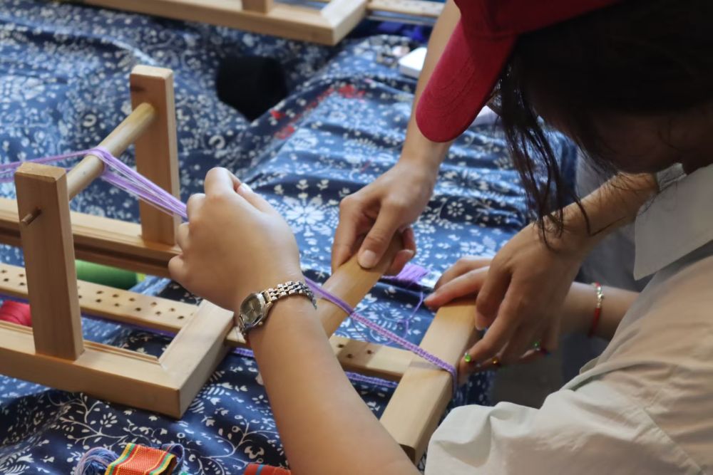 此外,團(tuán)隊(duì)還拜訪了彩帶的非遺傳承人藍(lán)老師。畬族彩帶是畬族婦女的傳統(tǒng)手工藝品,色彩艷麗,紋樣獨(dú)特,常用于服飾裝飾或節(jié)日饋贈(zèng)。藍(lán)老師現(xiàn)場(chǎng)展示了彩帶編織技藝,一根根絲線在她手中穿梭,逐漸形成精美的圖案。她介紹,彩帶上的紋樣多取材于自然,如山水、花卉等,也繡有漢字,如“福”字,寓意吉祥如意、幸福安康。彩帶編織不僅是一門手藝,更是畬族文化的象征,承載著畬族人民對(duì)美好生活的向往。