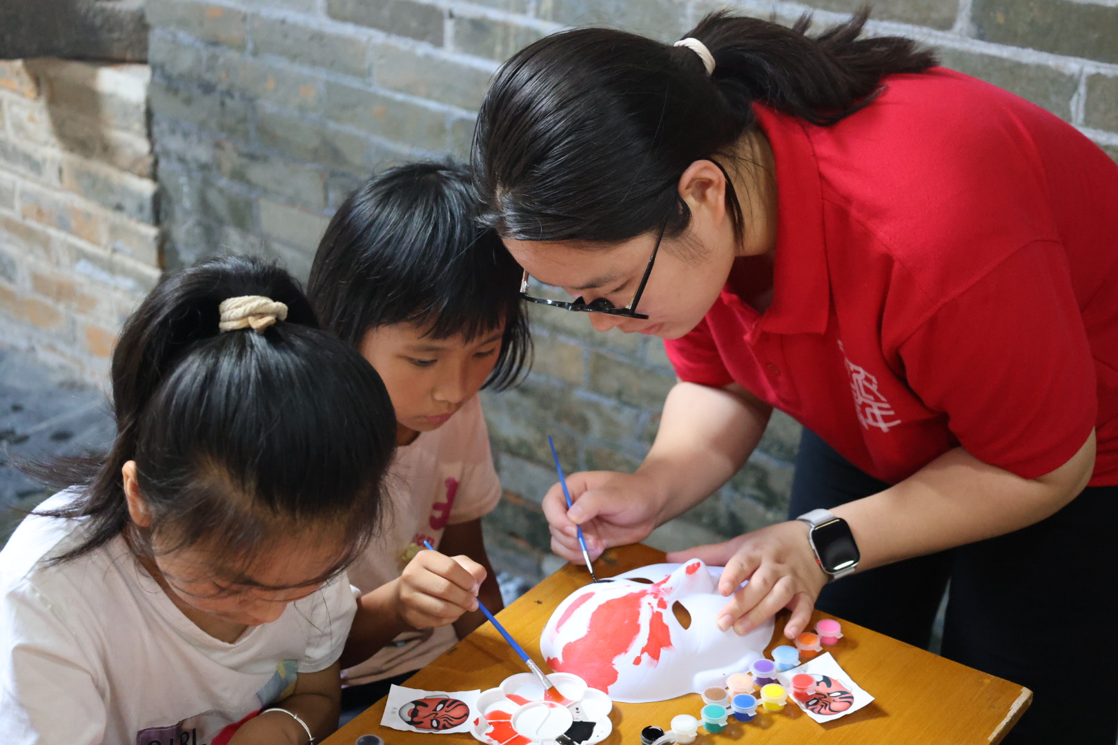 隊(duì)員們在楊梅村文明實(shí)踐站組織開展“戲曲臉譜繪制”非物質(zhì)文化遺產(chǎn)體驗(yàn)活動,指導(dǎo)孩子們調(diào)色運(yùn)筆,繪制經(jīng)典戲曲人物臉譜,結(jié)合《三國演義》等經(jīng)典名著片段作為教育契機(jī),使紅臉忠義、黑臉剛直等抽象文化符號轉(zhuǎn)化為易于理解的文化知識,將靜態(tài)的文化知識轉(zhuǎn)化為動態(tài)的實(shí)踐參與。孩子們在親身體驗(yàn)中,不僅感受到戲曲藝術(shù)的獨(dú)特魅力,更直觀領(lǐng)悟了臉譜承載的文化內(nèi)涵與價(jià)值理念。