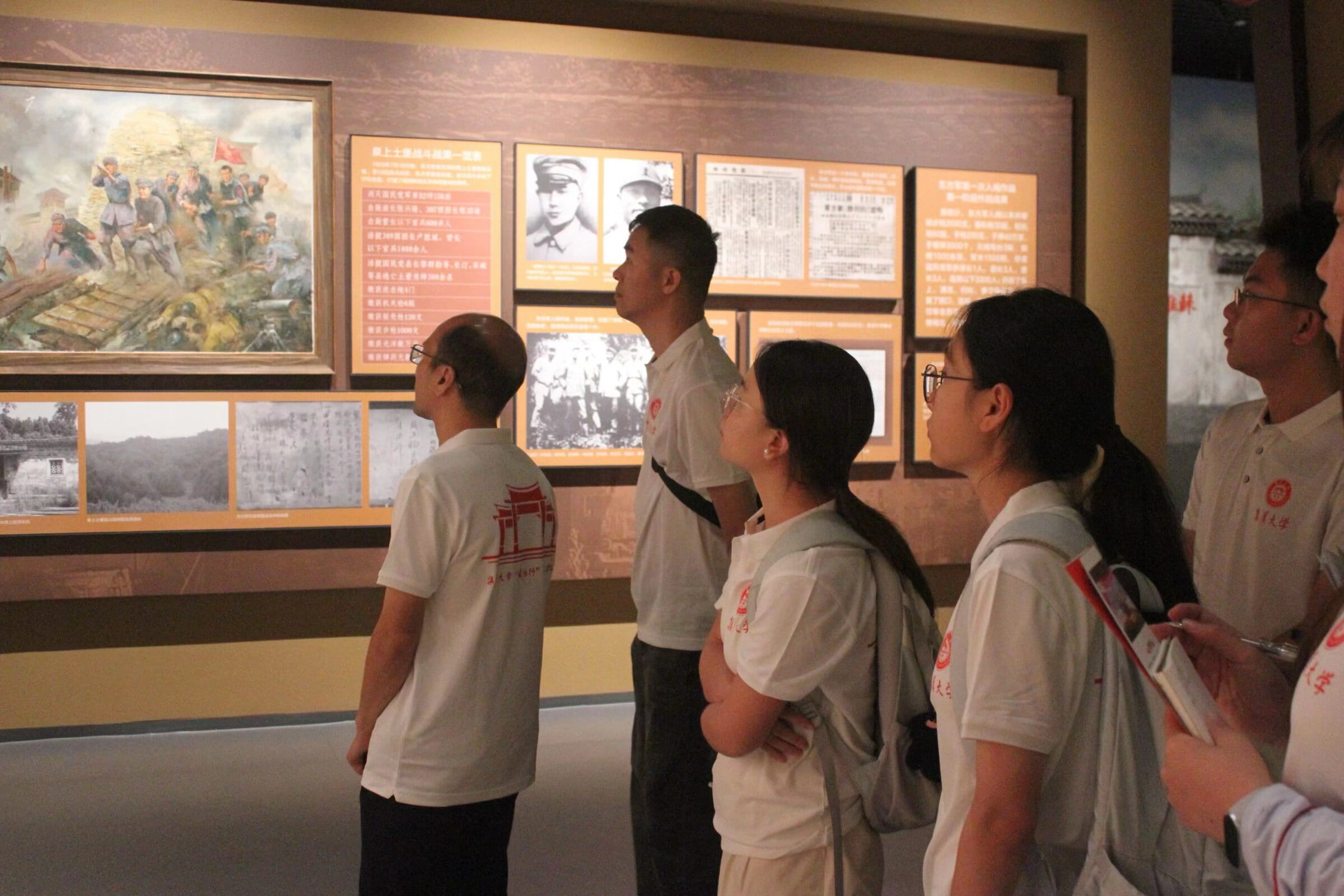 在鳳凰山紅軍長征出發地,沿著蜿蜒的紅軍街,實踐隊師生參觀了多處保存完好的革命舊址。斑駁土墻上,紅軍標語清晰可辨;街道兩旁的老建筑,仍保持著當年風貌。在紅四軍第十師二十九團一連連部舊址,通過實物展品,隊員們了解到紅軍戰士嚴明的紀律和艱苦的生活條件,深刻地感受到革命先輩們堅定的信仰和不畏犧牲的精神。