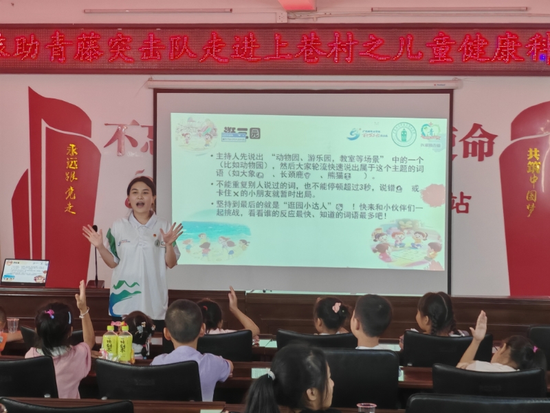 本次活動是廣東江門中醫藥職業學院百千萬工程“醫旅助青藤”突擊隊到杜阮鎮上巷村志愿服務活動系列中的其一,在活動之前,學生做了充分的籌備,精心制作教學PPT演示以及各類道具和獎勵小朋友們的各類小禮品,并在開始之時熱情迎接,以歌曲的形式帶入教學氛圍。