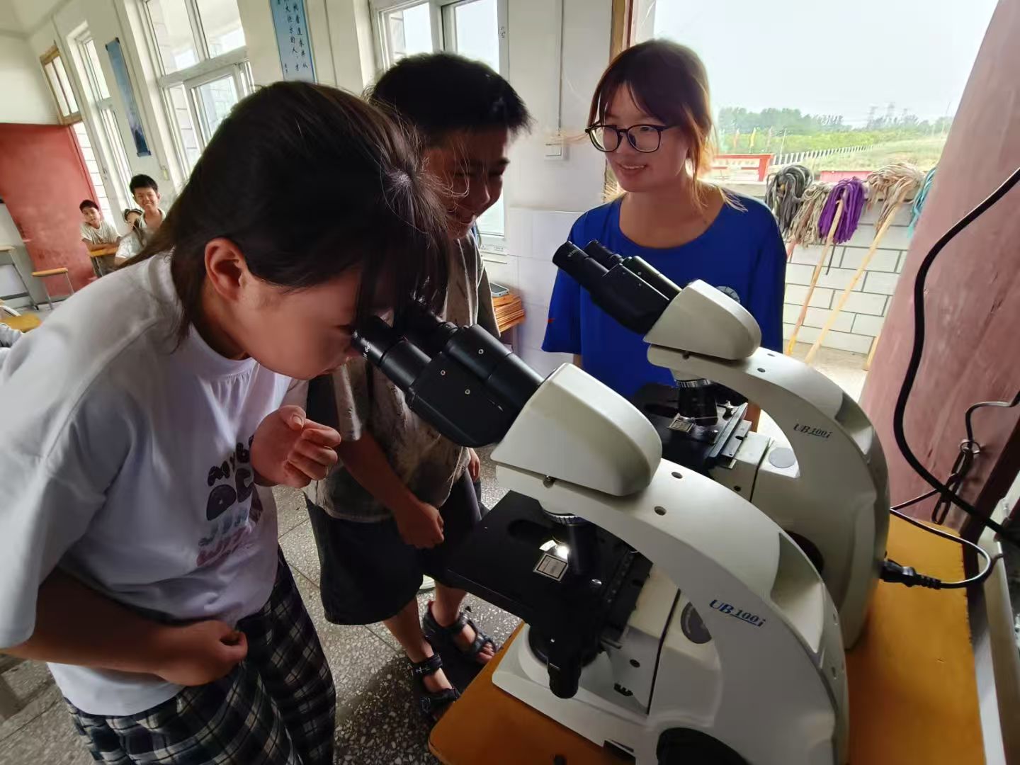 位于平頂山市魯山縣辛集鎮肖老莊村的一所小學,實踐團成員在此進行著“科學及生物實驗系列”,通過顯微觀察與知識講解,系統提升學生們普通話的應用能力,增加學生們的知識儲備,探索推普活動新道路。實踐團成員在教室中放置了數個顯微鏡,指導學生們進行植物細胞結構觀察,然后為他們講解細胞的結構,同步學習“葉綠體”“高爾基體”等專業名詞的標準發音,讓孩子們在學習普通話的同時,也能學習到科學知識。此外,實踐團成員們也為表現優秀的同學頒發了獎狀,鼓勵學生們使用普通話、說好普通話。