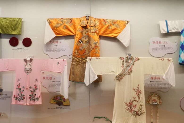 踏入大廳,精美的昆曲戲服陳列墻瞬間吸引目光。杜麗娘的粉色戲服、柳夢梅的素色長衫、大花神的龍紋戲服等,在玻璃展柜中靜靜訴說著角色故事。同學們駐足聆聽講解,從戲服的色彩搭配、刺繡紋樣里,解碼昆曲“以衣塑形、以形傳情”的藝術邏輯,感受傳統服飾與戲曲角色融合的獨特審美。