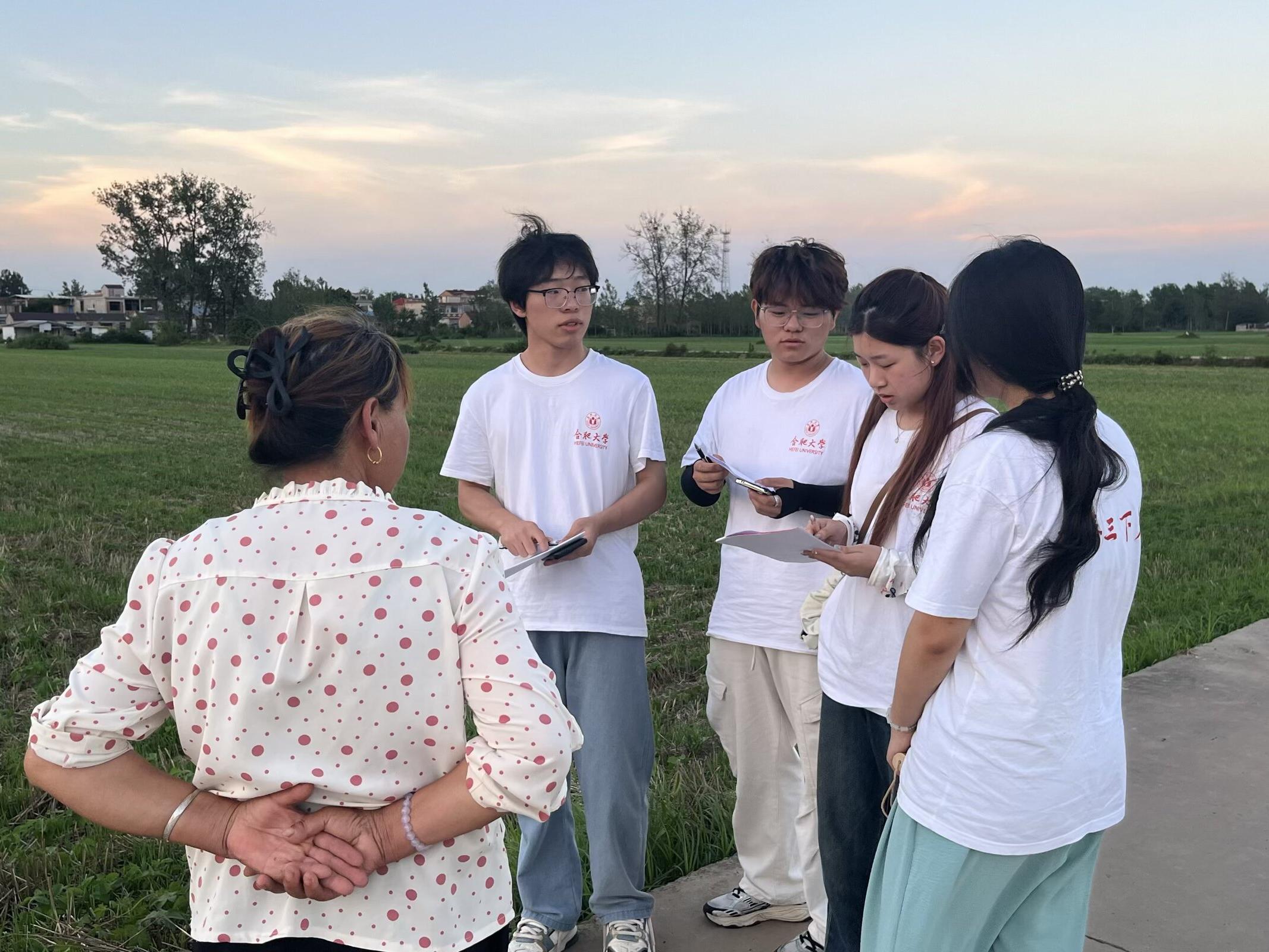 當夕陽為田野鍍上金邊,團隊帶領學生走進校園周邊農田開展社會實踐。田間地頭間,學生們手持記錄本,圍繞 “玉米灌溉頻率”“病蟲害綠色防治技術”等問題與農民伯伯深入交流,細致記錄土壤墑情、作物長勢等田間數據。志愿者借此契機打造“田間思政課”,引導學生在觀察農耕實踐中理解“誰知盤中餐”的深意,在泥土氣息中感知鄉村振興的時代圖景,推動課本知識與生產實踐的深度融合。