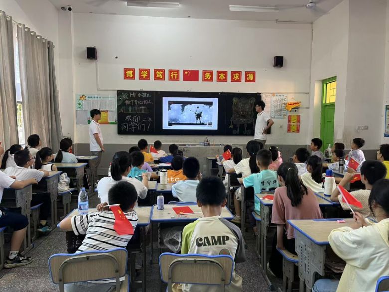 清早時(shí)分,鹵香筑夢(mèng)青年團(tuán)的所有成員為迎接重要的興趣課堂提前在教室做好了準(zhǔn)備,鹵香筑夢(mèng)青年團(tuán)與興趣課堂的同學(xué)們迎來(lái)了開(kāi)學(xué)第一課——歷史課,在開(kāi)課前歷史備課組的成員便為每一名同學(xué)準(zhǔn)備了鮮艷的五星紅旗,課堂圍繞“勿忘國(guó)恥,振興中華”這一主題展開(kāi),三下鄉(xiāng)團(tuán)隊(duì)隊(duì)員就抗日戰(zhàn)爭(zhēng)展開(kāi)講述,讓學(xué)生感受到了抗日先烈們?yōu)榱撕推侥甏牟恍缸非蠛蜔o(wú)謂犧牲,極大地激發(fā)了學(xué)生對(duì)中國(guó)近代抗?fàn)幨返呐d趣,桌上的紅旗隨同學(xué)們的手揮舞,伴隨著窗外清澈的蟬鳴,歷史課濃重的紅色氣息經(jīng)久不散。傳承紅色精神,延續(xù)紅色基因。三下鄉(xiāng)團(tuán)隊(duì)的歷史老師表示:“紅色基因年輕化是國(guó)家建設(shè)的底色,堅(jiān)定的理想信念是指引年輕一代越走越遠(yuǎn)的引路燈。”同學(xué)們專心致志的神情就是對(duì)歷史課堂最大的尊重,更是對(duì)歷史深刻的銘記。