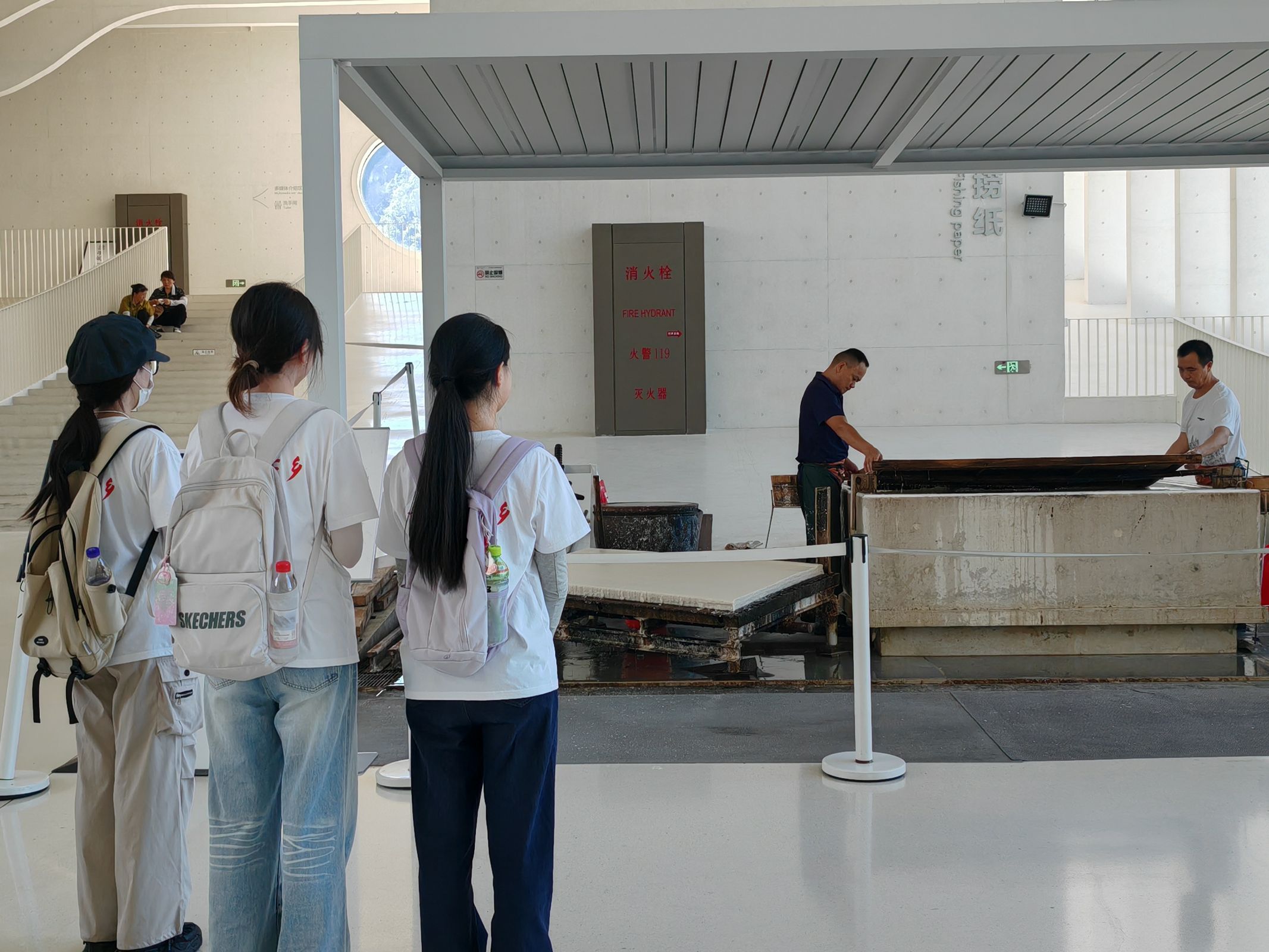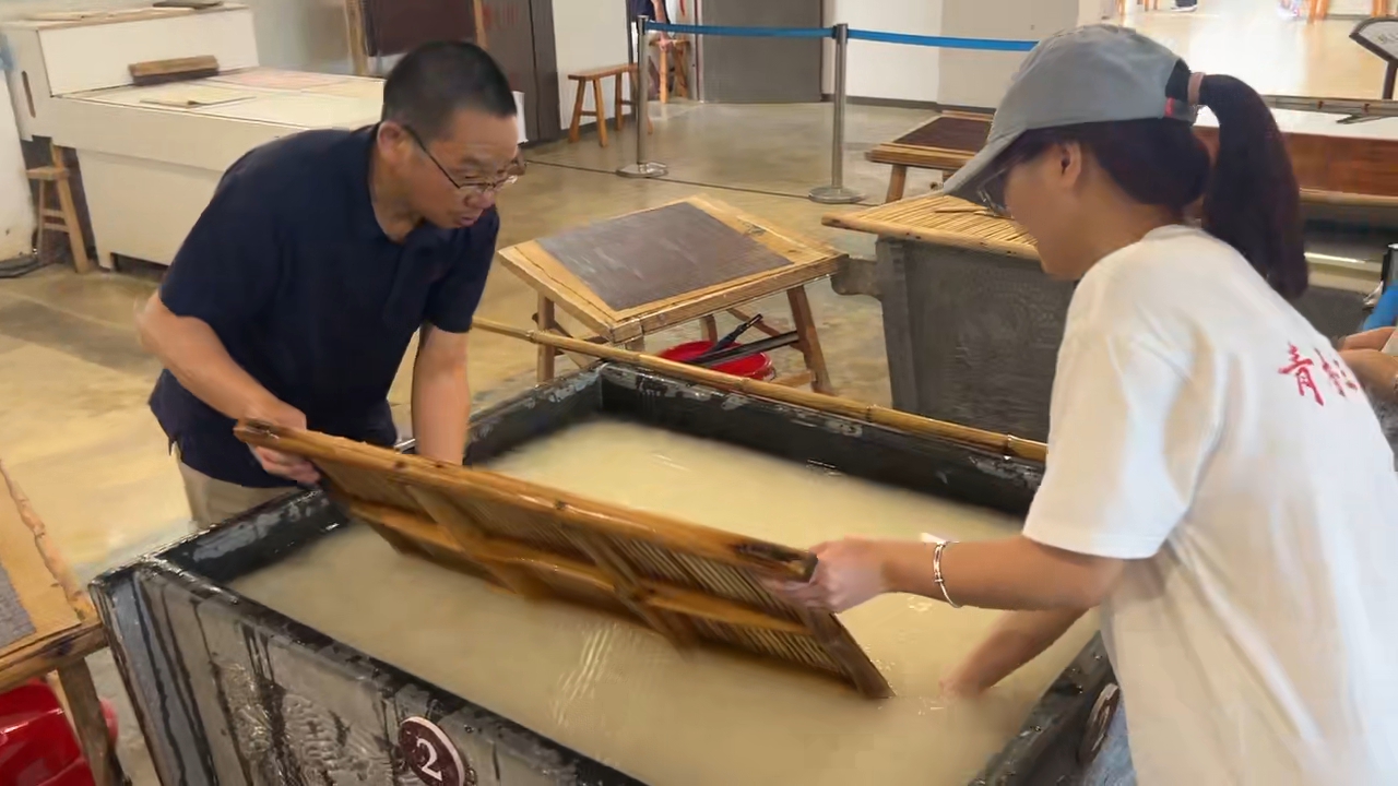 而在古法造紙體驗區,團隊成員們切實的看到匠人們是如何將一張宣紙制成。在“撈紙”技藝展區時,成員們看到匠人們手持竹簾浸入紙漿池,輕輕晃動、均勻撈起,再經壓水、揭紙等環節,一張薄如蟬翼的濕紙坯逐漸成形,不禁感嘆宣紙這項非遺文化的魅力與技藝的精細。此外,團隊還參觀了宣紙曬紙的方式。數張濕紙整齊排列在木架上,陽光透過紙張投射出斑駁光影,匠人手持長桿翻紙、調整角度,確保紙張均勻干燥。