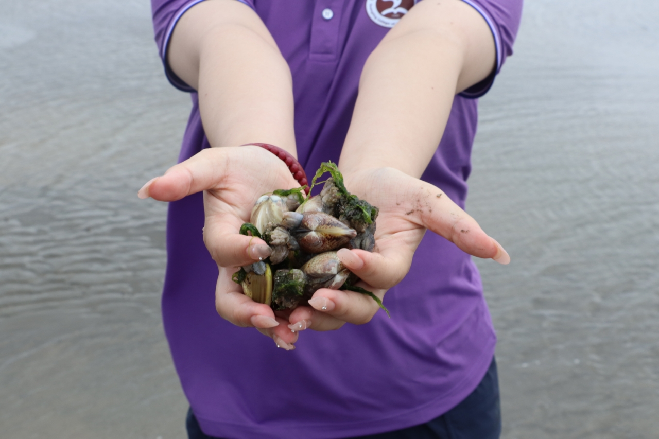 | (圖為7月5日,“碧海青耘,向海而興”團(tuán)隊(duì)成員展示所挖文蛤。孫佳康供圖。) |