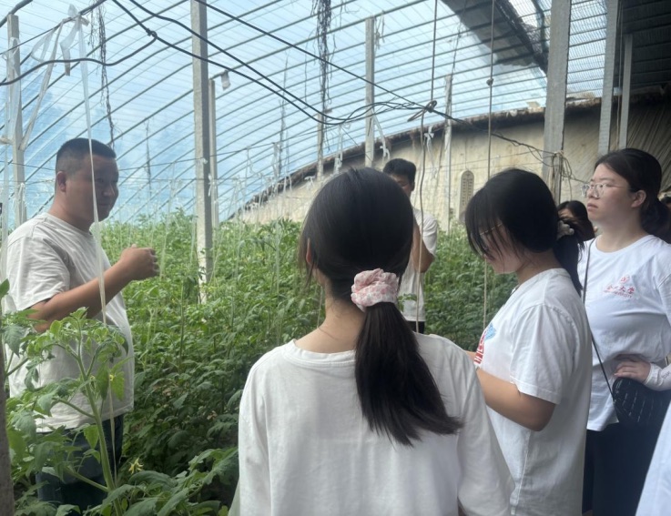 實踐成員有序深入暖棚區,聚焦番茄植株生長細節,仔細觀察葉片形態、色澤,查看果實掛果密度與發育狀態,從農業技術角度探究種植培育要點;調研過程中,建潁鄉黨委副書記藍子添全程參與,為團隊詳細梳理基地發展脈絡。