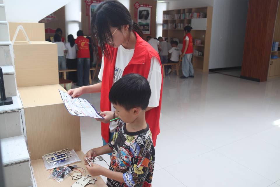 圖為團隊成員和小朋友進行科技小制作 劉安童 攝