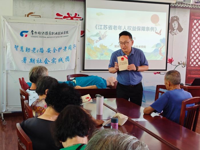 活動(dòng)期間,實(shí)踐團(tuán)精心策劃并實(shí)施了五大主題板塊,內(nèi)容豐富、形式多樣。在“學(xué)急救知識(shí),守家人平安”環(huán)節(jié),志愿者們現(xiàn)場(chǎng)演示了AED器材的使用方法和人工呼吸操作流程,使老年人掌握了基本的應(yīng)急救護(hù)技能,增強(qiáng)了他們?cè)诰o急情況下的自救互救能力。在“宣普法知識(shí),護(hù)老年權(quán)益”板塊,指導(dǎo)老師俞旭為老年人帶來了生動(dòng)的普法宣講,提高了他們的法制意識(shí),同時(shí),他還提供了現(xiàn)場(chǎng)咨詢服務(wù),解答老年人在法律維權(quán)方面的疑惑,并助力構(gòu)建社區(qū)與法律顧問的長(zhǎng)效合作機(jī)制。在“銀發(fā)就業(yè)發(fā)余熱,社會(huì)添彩增活力”環(huán)節(jié),實(shí)踐團(tuán)成員先后調(diào)研了常州市人社局、武進(jìn)區(qū)人才服務(wù)中心與竹園社區(qū)黨群服務(wù)中心等相關(guān)部門,系統(tǒng)了解了當(dāng)前常州市人口老齡化的現(xiàn)狀,以及應(yīng)對(duì)人口老齡化所采取的再就業(yè)措施,實(shí)踐團(tuán)將針對(duì)調(diào)研數(shù)據(jù)結(jié)合學(xué)校優(yōu)勢(shì)助力常州老年人再就業(yè)政策的制定與相關(guān)服務(wù)的推進(jìn)。