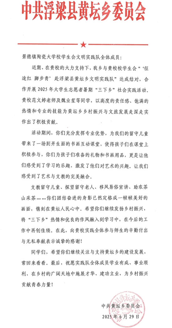 (圖為黃壇鄉政府為景德鎮陶瓷大學學生會所寫感謝信)