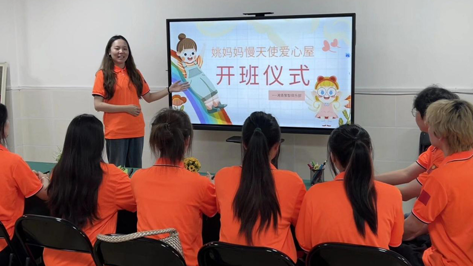 參觀結束后,團隊指導老師在愛心屋二樓組織開展“開班儀式”。現場,熊賽男老師首先向全體成員強調實踐期間的服務規范,要求大家以耐心、細心的態度對待每一位“慢天使”們,在陪伴交流與教學活動中恪守言行準則;同時強調責任意識,明確每位成員在日常照料、康復協助等工作中的具體職責。
