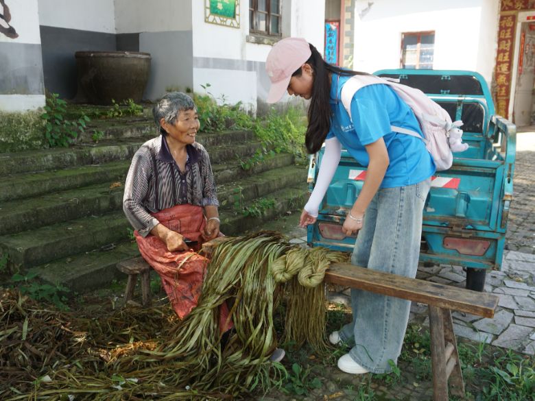 實(shí)踐團(tuán)抵達(dá)汪橋村后,與村委會(huì)迅速對(duì)接,在團(tuán)委書記汪靜引領(lǐng)下走進(jìn)村史館開展紅色研學(xué)。館內(nèi)抗戰(zhàn)水壺、英雄勛章等文物,搭配展現(xiàn)巢北抗戰(zhàn)歷史的展板與“英雄柳”“大廟橋小學(xué)”等故事講解,讓成員們深刻感悟革命先輩英勇,堅(jiān)定理想信念。走出村史館,眾人在“英雄柳”下聆聽群眾抗日故事,深受家國情懷觸動(dòng)。在了解紅色歷史后,實(shí)踐團(tuán)深入鄉(xiāng)村產(chǎn)業(yè)與非遺傳承場景。在茶干廠,成員觀摩了泡豆、磨漿到點(diǎn)鹵成型的傳統(tǒng)豆腐制作工藝,每道工序都凝結(jié)著村民的匠心;偶遇手工搓麻繩的老人時(shí),大家圍聚聆聽,從翻飛的麻線中體悟手工技藝的歲月故事。最后,實(shí)踐團(tuán)走進(jìn)碧根果種植園,通過發(fā)放問卷收集村民對(duì)產(chǎn)業(yè)發(fā)展的建議;在菌菇培育基地,現(xiàn)代農(nóng)業(yè)種植技術(shù)的創(chuàng)新與高效,為成員們探索鄉(xiāng)村振興路徑提供了新思路。