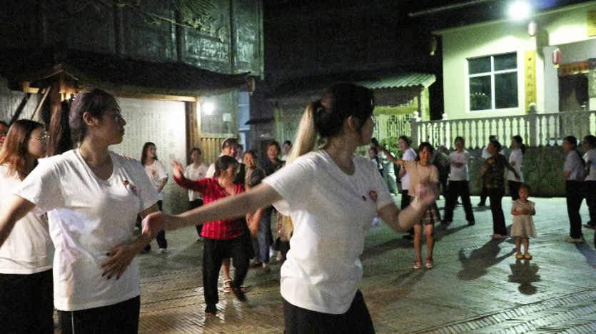 酉陽(yáng)縣地處武陵山區(qū),何家?guī)r村作為土家族重要聚居地之一,保留著豐富的民族文化資源。擺手舞是土家族最主要的標(biāo)志性文化形態(tài),2008年,擺手舞被列入首批國(guó)家級(jí)非物質(zhì)文化遺產(chǎn)名錄,是土家人祭祀神靈、酬報(bào)先祖和傳承民族文化的重要形式。傍晚時(shí)分,志愿者們?cè)诖甯刹康膸ьI(lǐng)下,走進(jìn)村里的文化廣場(chǎng),與村民們圍在一起,伴隨著音樂(lè),共同跳起擺手舞。村民們還唱起當(dāng)?shù)靥厣礁瑁瑲g迎團(tuán)隊(duì)成員。帶隊(duì)負(fù)責(zé)人懷著對(duì)家鄉(xiāng)的深厚情感,登臺(tái)演唱了歌曲《落葉歸根》。歌唱結(jié)束后,他表示,他是酉陽(yáng)的孩子,希望能用所學(xué)回報(bào)家鄉(xiāng),讓家鄉(xiāng)發(fā)展更好。隨后,重師師生與村民們手牽手,再次跳起擺手舞,大家圍成圓圈,歡快舞動(dòng),現(xiàn)場(chǎng)洋溢著歡樂(lè)氛圍。