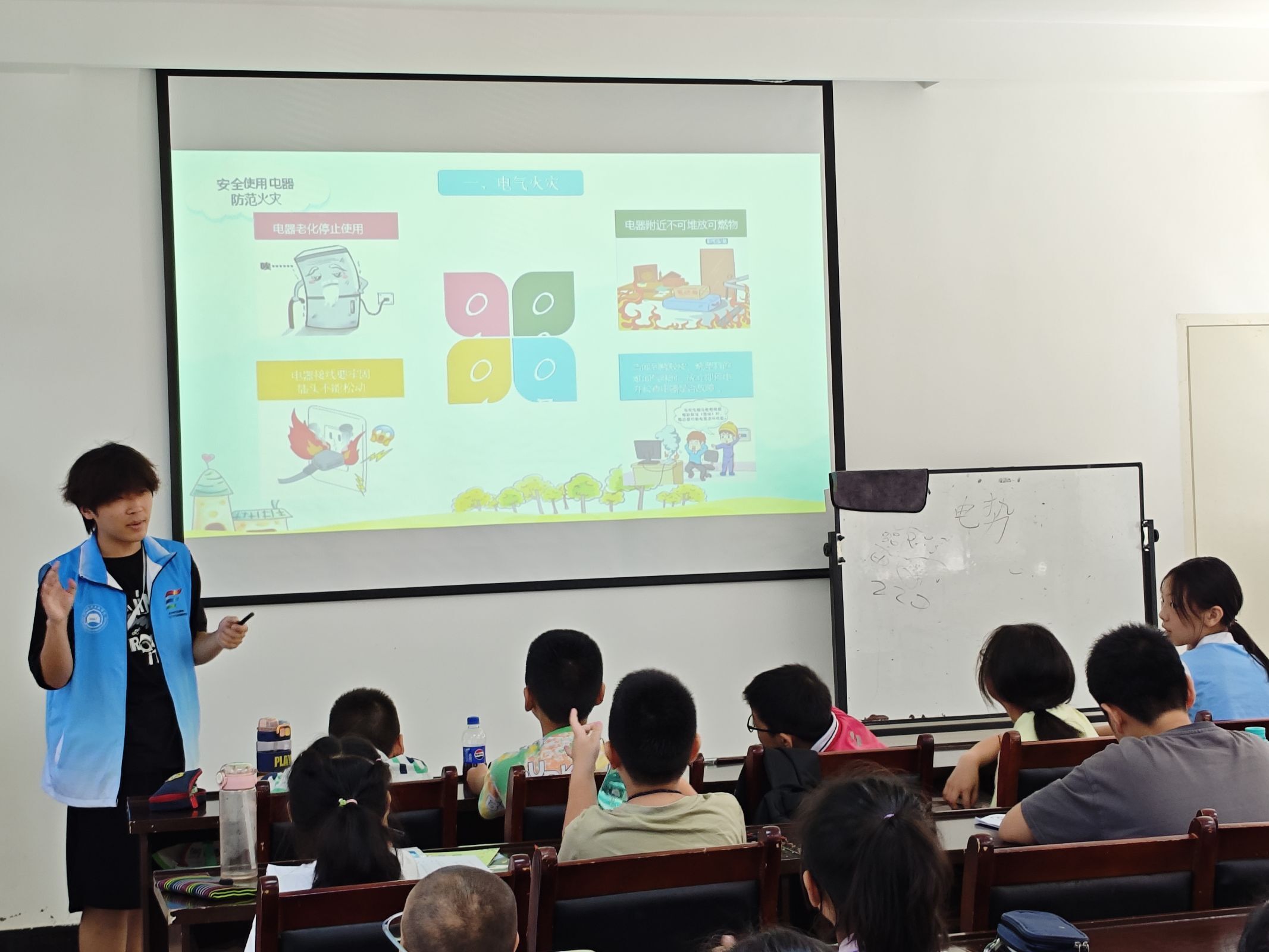 科普課最后,志愿者帶領孩子們學習了安全用電順口溜:“家用電器需防水,要裝漏電保護器;濕手不能碰電器;插頭要握絕緣體;戶外遠離高壓線;躲開變壓器,安全不觸電。”朗朗上口的順口溜讓孩子們在輕松記憶中強化了安全用電意識。志愿者還展示了常見的電安全標志,如“有點危險”“請勿靠近”等,幫助孩子們識別生活中的用電危險區域。