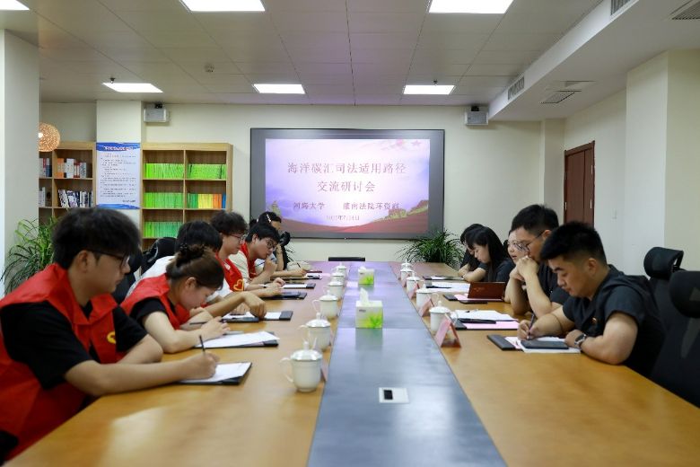下午三點五十左右,實踐團成員與灌河流域環境資源法庭等人在圖書閱覽室成功開展“海洋碳匯司法適用路徑”交流研討會,灌南縣人民法院專職委員蒯舒、環資庭庭長高濤、環資庭法官助理卜一欣、環資庭法官助理孫中正和公務員何雨潤出席本次交流研討會。