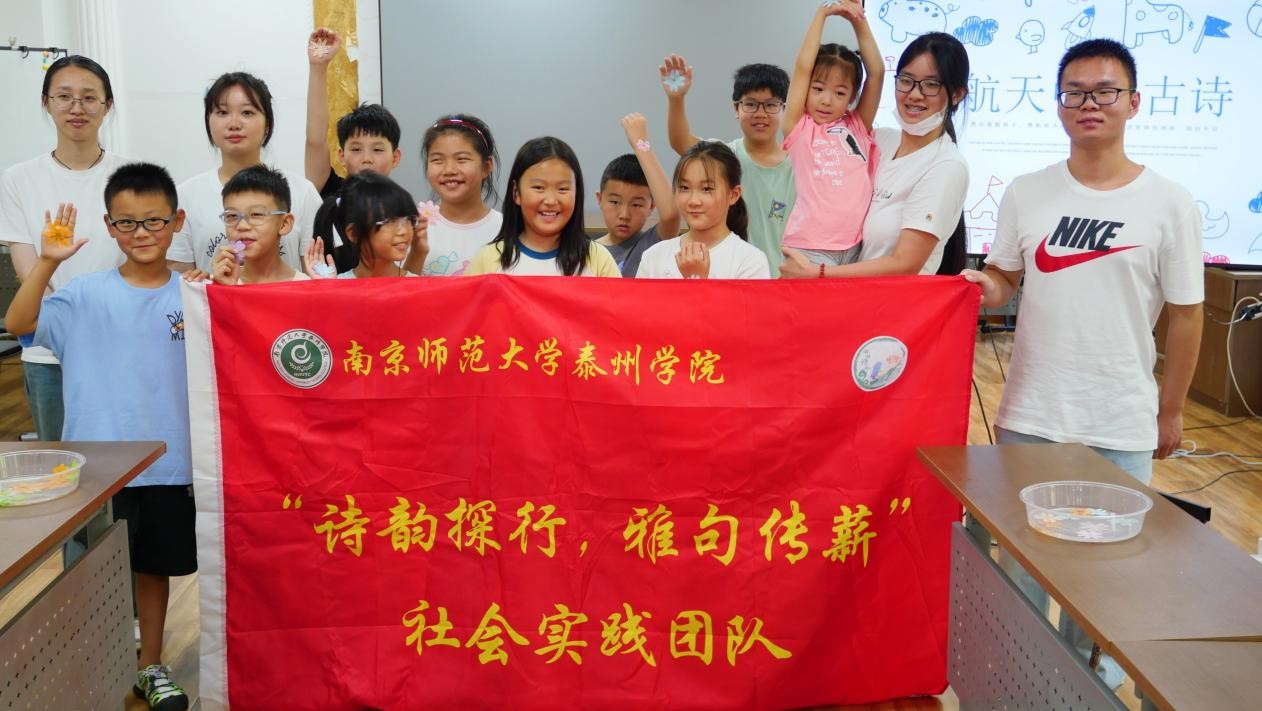 活動的最后,孩子們手持紅色的橫幅,與老師們一起合影留念。橫幅上寫著“南京師范大學泰州學院”、“詩韻探行,雅句傳薪”、“社會實踐團隊”等字樣,見證了這次活動的圓滿成功。