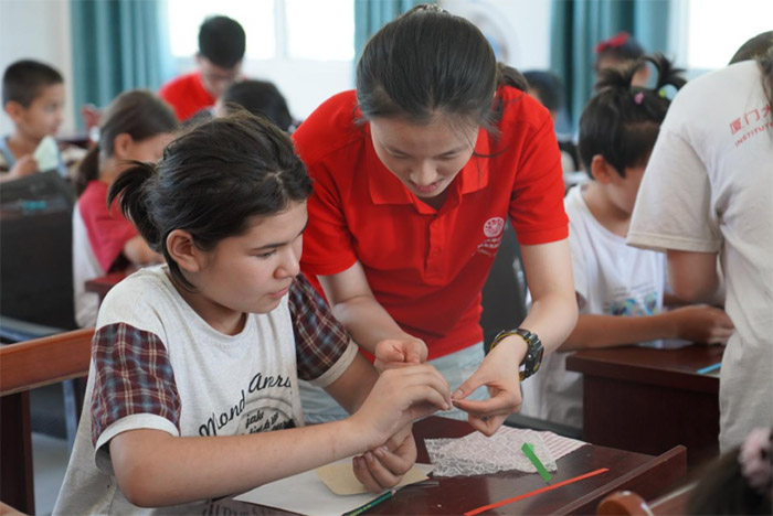 (圖3實踐隊員在布藝拼貼課上教當?shù)氐男『ⅲ?/div>