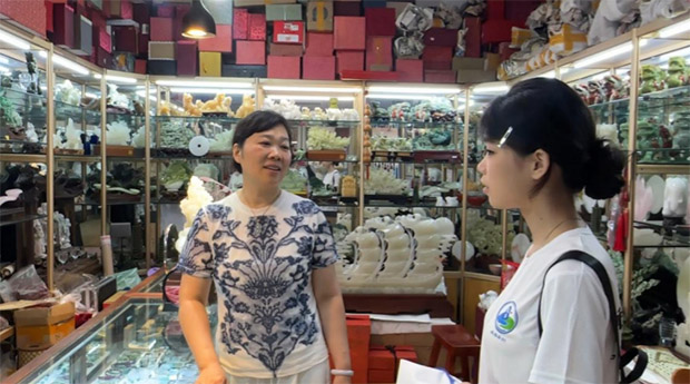 林老板介紹道,市面上的石敢當(dāng)?shù)窨淘O(shè)計(jì)大多簡(jiǎn)單而相似,文化底蘊(yùn)極低,制造則主要采用機(jī)器流水線生產(chǎn),要想出彩只能從制造工藝下功夫,因此她堅(jiān)持手工雕刻為主、機(jī)器輔助為輔的制造模式。她還向團(tuán)隊(duì)成員詳細(xì)展示了玉雕從選料、打胚、塑形到上色的完整流程,并結(jié)合自身多年的從業(yè)經(jīng)驗(yàn),對(duì)比分析了手工雕刻與機(jī)器雕刻的差異,她強(qiáng)調(diào)機(jī)器雕刻的作品缺少靈性,在價(jià)值上遠(yuǎn)不及手工雕刻產(chǎn)品。雖然手工雕刻的成本極高,但林老板依然堅(jiān)守著初心,不斷嘗試帶領(lǐng)手工雕刻行業(yè)走出困境。通過(guò)與林老板的交流以及對(duì)市場(chǎng)內(nèi)其他攤位的走訪,團(tuán)隊(duì)對(duì)傳統(tǒng)手工雕刻的技法傳承和經(jīng)營(yíng)現(xiàn)狀有了初步的直觀認(rèn)識(shí)。