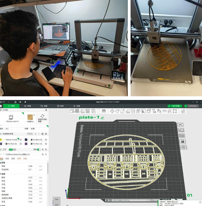三、借數字創新拓寬非遺傳承,讓影響“走得遠” 0.1毫米的掐絲誤差,曾是匠人十年的功力門檻。如今,建模技術讓能讓沒有“十年功”的我們,也能觸摸到非遺技藝的精準內核。團隊以“數字建模+3D打印+手工精做”的方式,既留存了傳統掐絲琺瑯畫中彩砂裝填的鮮活質感,又為這門古老技藝開辟了新的傳承賽道——團隊成員使用NX、Solidworks、Blender、bambustudio等軟件探索線稿建模,驅動3D打印復刻傳統掐絲軌跡,數字技術正一步步將傳統手工里的“手感經驗”,轉化為可復制、可學習的標準化流程。與此同時,團隊以非遺作品為媒介,探索制作云游上海紅色地標小程序,在新時代中,讓紅色文化搭載著非遺文化實現更為廣域的傳播。