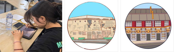 團隊成員以數智為橋,用AI繪圖軟件和Procreate電子繪圖軟件復刻中共一大會址木窗紋路、四行倉庫彈痕墻面等,將團隊成員留下足跡的紅色地標細節轉化為琺瑯畫稿,讓更多人清晰“看見”歷史,讀懂當代青年講述的紅色故事。