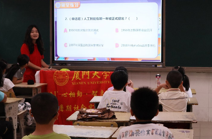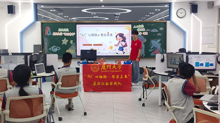 為響應國家教育數字化戰略和《教育強國建設規劃綱要(2024-2035年)》中“促進人工智能助力教育變革”的號召,廈門大學信息學院“‘AI’心相助·智啟未來”實踐隊在2025年7月深入廈門市多個社區與學校,通過實地調研、AI科普與編程教學,將前沿科技的種子播撒到青少年心中,用專業知識助力構建公平、可持續的基礎教育生態。