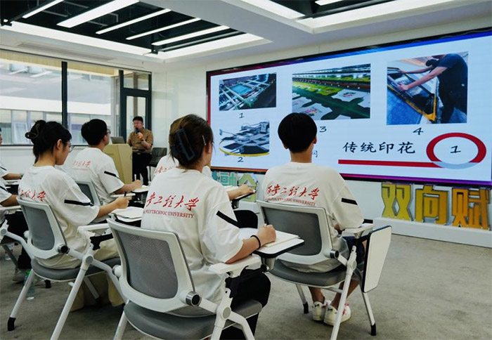 在紹興(柯橋)印染工程師協(xié)同創(chuàng)新中心,高級工程師張為海為實(shí)踐隊(duì)帶來了一場精彩的學(xué)術(shù)報(bào)告會。張為海工程師憑借在印花領(lǐng)域豐富的實(shí)踐經(jīng)驗(yàn)和專業(yè)知識,深入講解了傳統(tǒng)印花、數(shù)碼印花等先進(jìn)印花技術(shù)的原理、工藝流程以及在實(shí)際生產(chǎn)中的應(yīng)用案例,隊(duì)員們認(rèn)真聆聽,認(rèn)真做筆記。