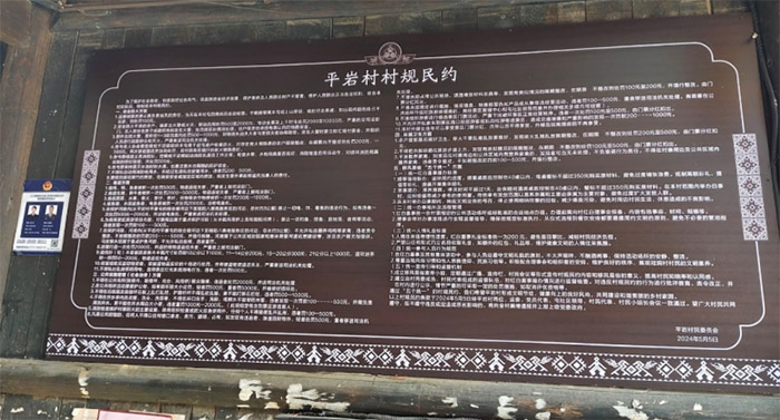 在程陽八寨景區(qū)內的平巖村,實踐團通過入戶訪談與村委會座談,系統(tǒng)梳理了該村融合傳統(tǒng)“款約”與現代治理的實踐。該地村規(guī)民約明確涵蓋安全防火、偷盜懲戒、環(huán)境衛(wèi)生、移風易俗等條款,尤其針對旅游發(fā)展需求,規(guī)定“村寨周邊半截風雨橋至程陽河界為重點保護河段,禁止釣魚、撈魚、放地籠及漁網作業(yè),違者罰款100-500元”。村干部表示,自條款實施以來,河道生態(tài)持續(xù)向好,村內秩序更趨和諧。