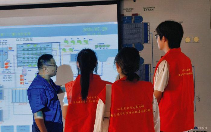 在商丘市康達環保水務有限公司污水處理廠,渾濁的生活污水經過格柵、沉砂、生化處理、深度過濾等一道道“關卡”,最終變得清澈透明。負責人詳細講解了AAO工藝(厭氧-缺氧-好氧法)的核心原理與節能降耗的關鍵控制點。團隊負責人齊珂穎同學結合前期策劃案中的實驗基礎,重點詢問了處理過程中碳排放監測與中水回用情況,探尋節水與降碳的協同點。